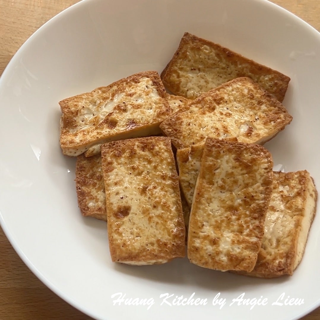 - Heat oil in wok and then fry the tofu using medium or low heat till golden on both sides, about 5 minutes.