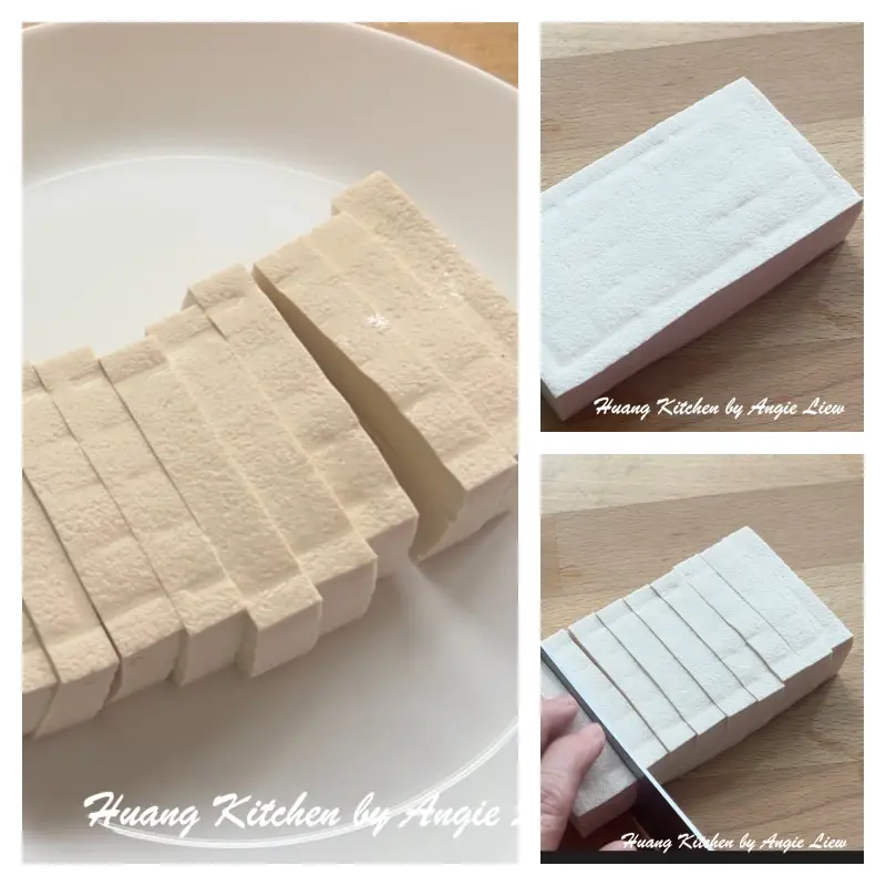 Prepare a large piece of firm and tender tofu. Cut the tofu into thick slices, about 1 cm thick. Transfer to a plate and set aside.