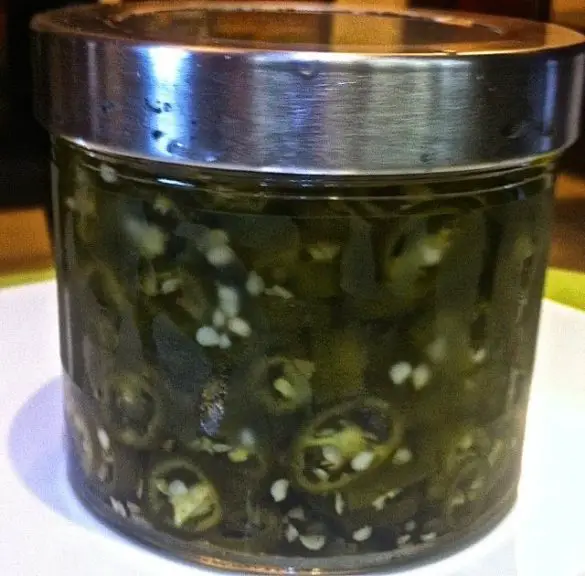 - Pour the vinegar mixture into the jar to pickle the chillies.