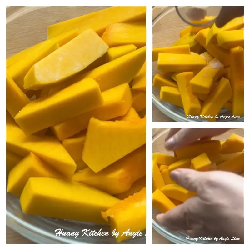 - First remove the seeds and skin of the pumpkin. Then cut the pumpkin into long rectangle pieces. Next season with salt for about 15 minutes. Then coat the pumpkin with cornstarch. Shake off excess cornstarch.