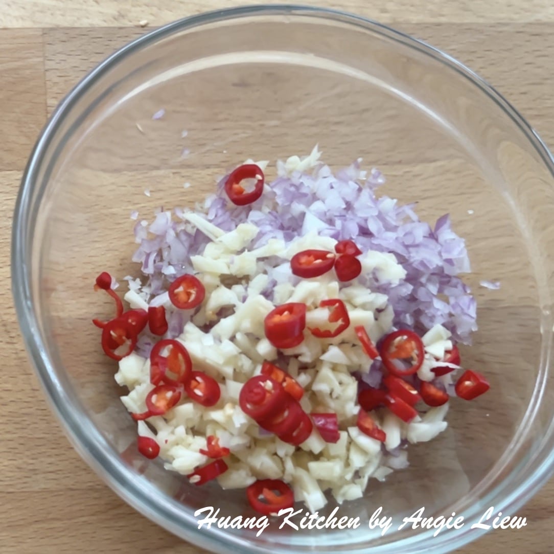 - Prepare spices by chopping finely lemongrass, garlic and shallots. Dice some bird eye’s chillies and rinse dried shrimp.