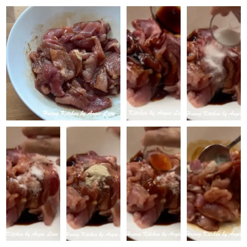 - Add light soy sauce, sesame oil, sugar, ground white pepper, salt and marinade 2 hours.
