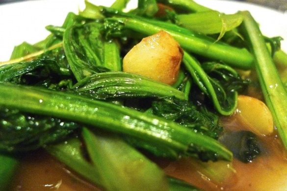 Quick to cook, simple and delicious, Chinese greens are a great way to add a vegetable dish to our meal. You can use any mixture of good Chinese greens for this recipe. The key to getting this dish right is to have fresh Chinese greens and cook them simply and quickly with garlic flavoured oil. If the greens is fresh, there is no need to add salt or sugar as the abalone scallop sauce or chicken broth will add enough saltiness to the dish.