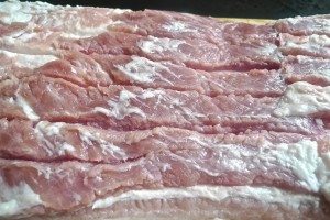 Flip the pork belly over skin side down. On the meat side make shallow cuts across the length of meat.