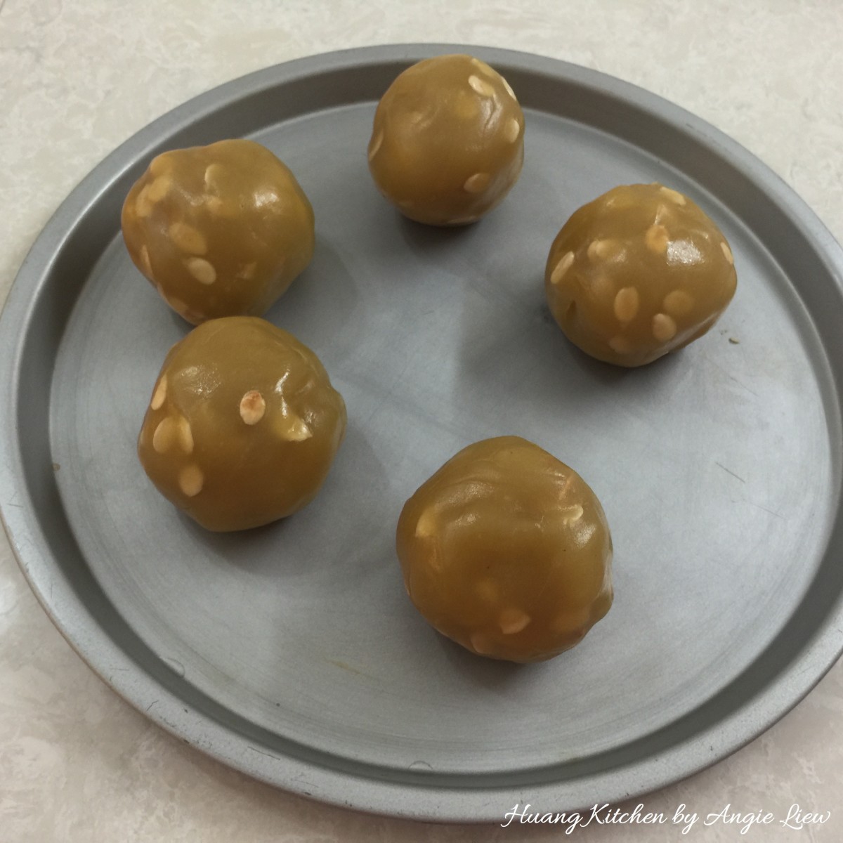 Wrap each piece of lotus paste with one egg yolk (15g) and form into balls. You should have 5 lotus paste balls, each weighing 120g.