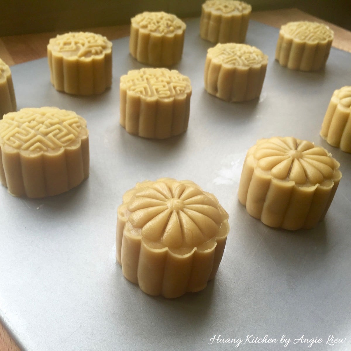 Then bake the mooncakes until the mooncake skin toughens and the edges of the mooncakes start to turn golden, about 10 minutes.