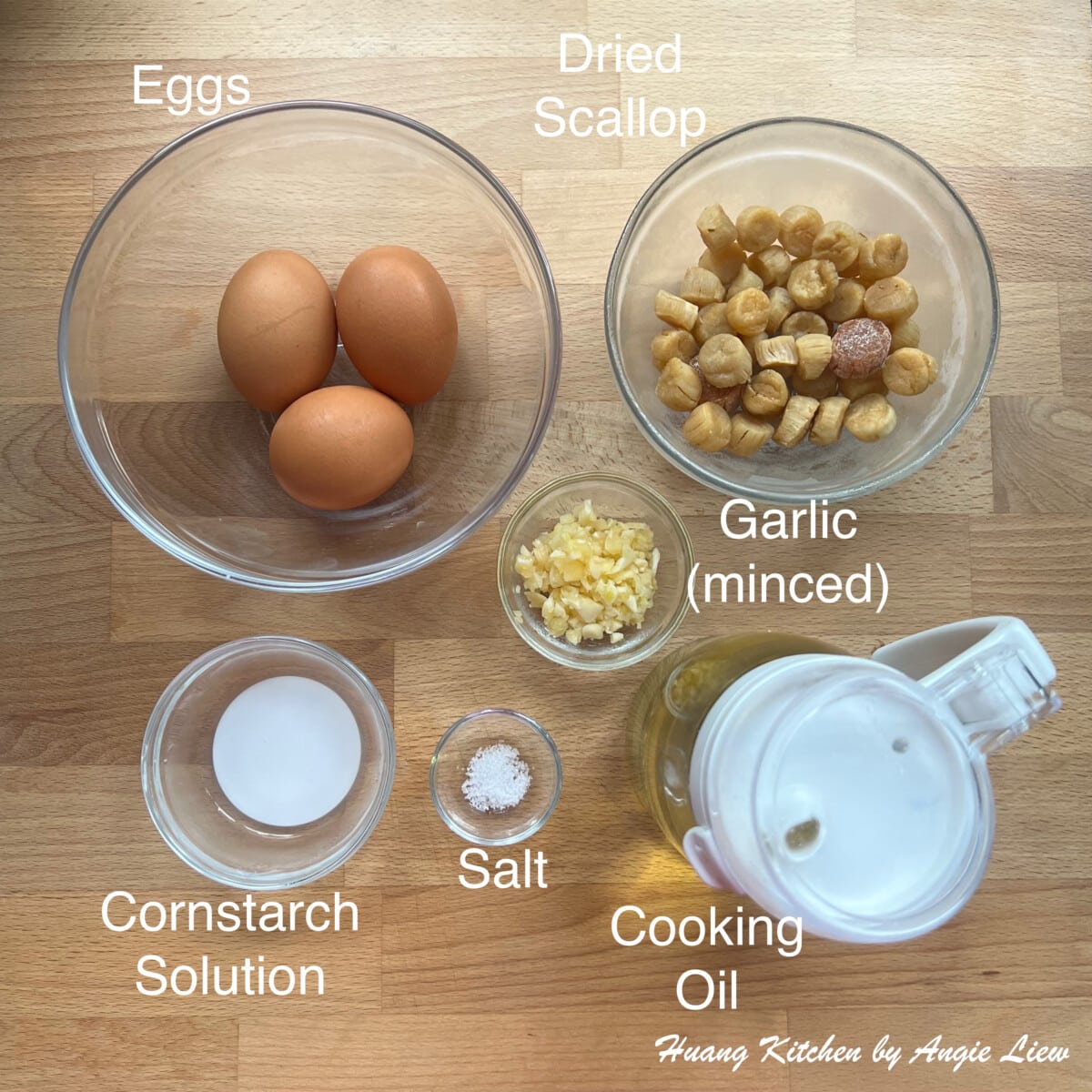 - Break eggs into a large bowl. Add cornstarch and salt. Mix well with a fork. Add in half of the soaked dried scallop. Mix well and set aside.