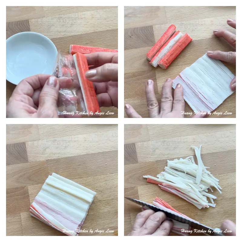 Remove wrapper from crab stick. Unroll the crab stick, place together and cut into long strips.
