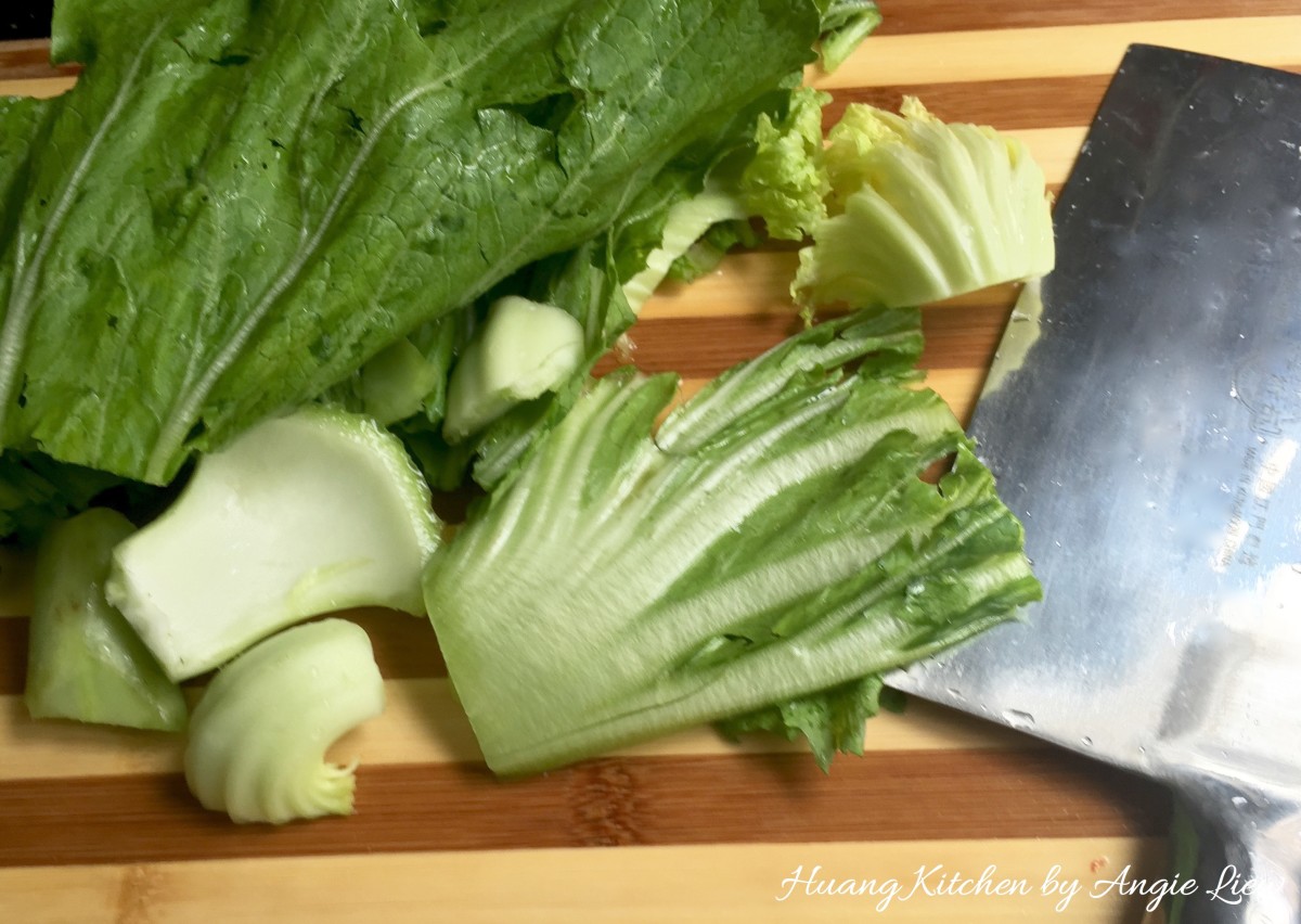 First, rinse well the fresh mustard green vegetables and then cut into large pieces, about 2 inches piece.