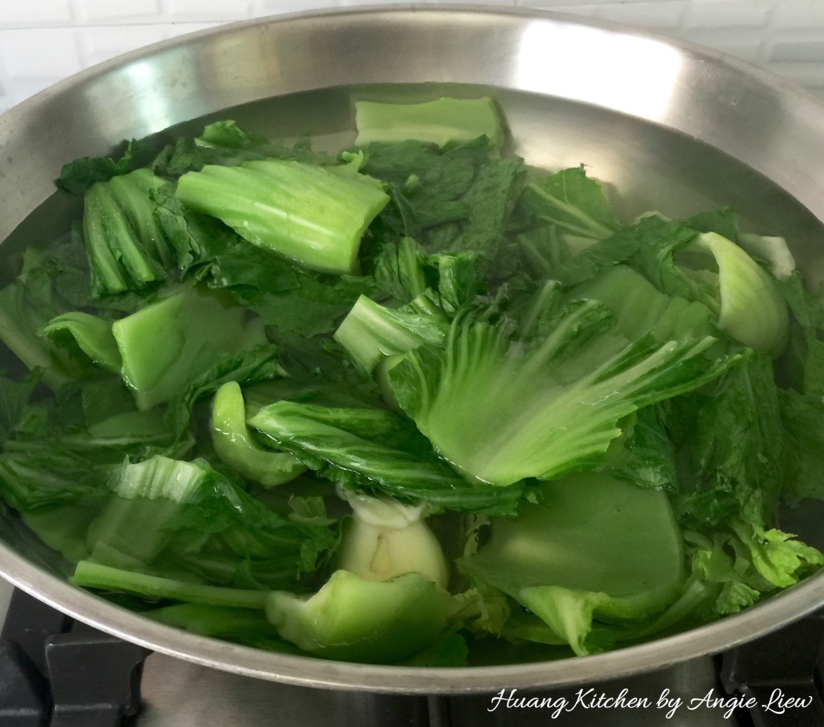 Add in the blanched mustard greens. The vegetables may seem a lot but they will cook down.