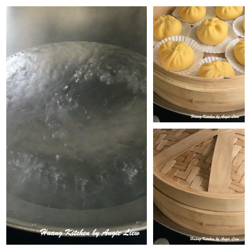 Meanwhile prepare steamer by bringing awater in the wok to a boil. Then place the buns in the bamboo steamer on the wok. Cover and steam the buns over high heat for 15 minutes.