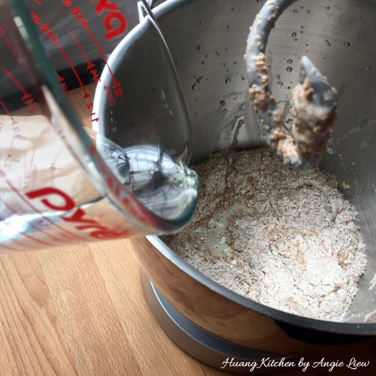 Add water and using a dough hook, mix till an elastic dough is formed.