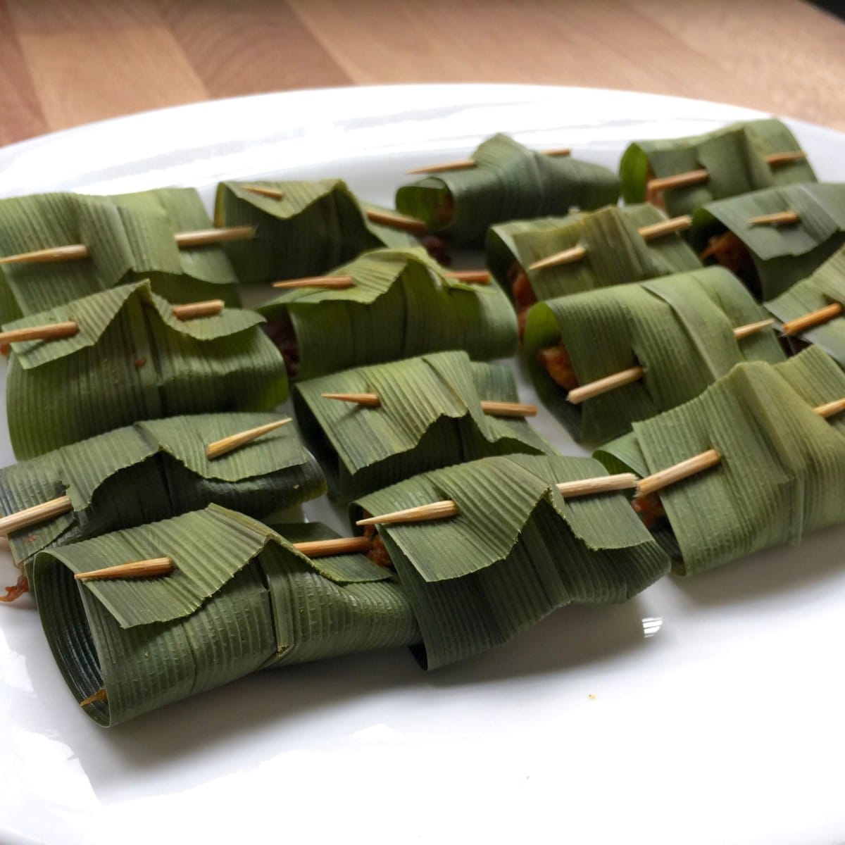 Aside from looking nice, screw pine leaves provide an added sweet enticing aroma to these steamed vegetarian chicken pieces. The amazing aroma of the leaves imparted in the vegetarian meat gives this otherwise ordinary and plain gluten pieces a distinct flavour and the wrapping, a unique presentation. They make great party appetizers and can also be served as a main or side dish.
